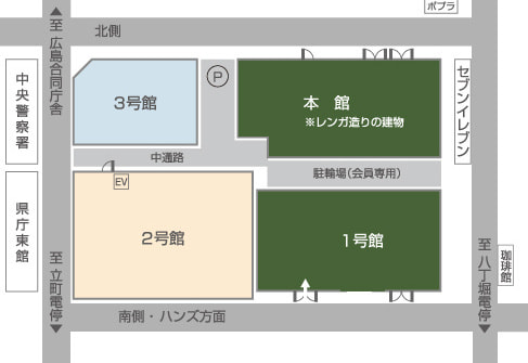 - JR広島駅より徒歩20分、市内電車(5番以外)「立町」電停下車徒歩3分