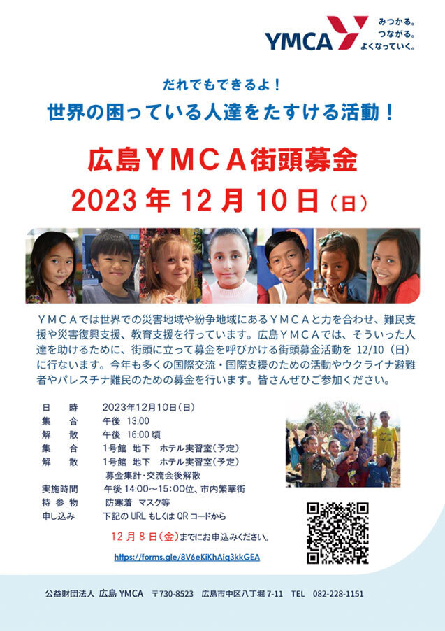 毎年11月から2月末にかけて、YMCAでは国際協力募金活動を行なっています。特に12月には、会員の 方々や子ども達と街頭に立って、市⺠のみなさまに募金を呼びかけています。募金はYMCAが行う国際 交流活動や海外の災害支援などにユースを派遣する活動に使われます。毎年、広島YMCAには150万〜 200万円の募金が寄せられています。