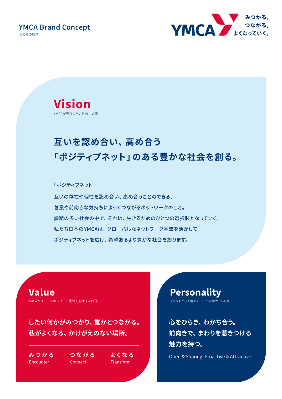 YMCAが定めたブランドコンセプト(上記)のバリュー(価値)、「みつかる。つながる。よくなる。」の結びを、「よくなっていく。」としました。出会いとつながりから生まれる「よくなる」チカラが連鎖して、一人ひとりが、そして地域が、社会が「よくなっていく」、そのような願いをこめています。