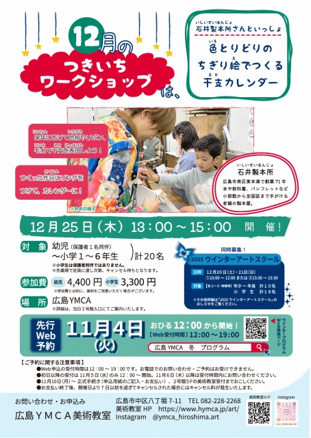 | 冬休みの特別授業!2つのトクベツなプログラム☆ 2025年11月4日(火)おひる12:00〜 サマーアートスクール・つきいちワークショップ、いずれも初日はWeb予約! ![]() ●専用ページから予約フォームでのご予約です。● ※11月4日(火)【先行Web予約時間】12:00〜19:00 詳しくは広島YMCAウインタープログラム専用ページからご確認ください。↓ 広島YMCA ウインターシーズンプログラム ※先行Web予約は11月4日(火)のみです。 お電話でのご予約・変更については、11月5日(水)12:00〜スタートいたします。 11月6日(木)以降は、10:00〜18:00 お電話または美術教室受付にて承ります。