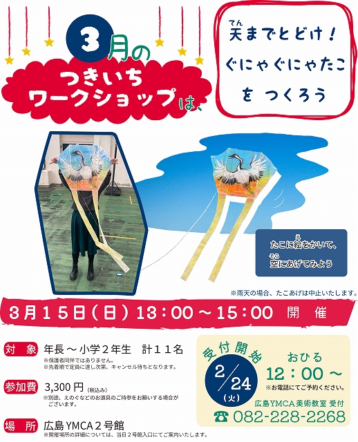 【予約開始】お電話にて 2月24日(火) おひる12:00〜 (082)-228-2268 美術教室受付 広島YMCA 美術教室 【受付時間】月〜土 10:00〜18:00 |