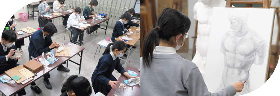 内容はデッサンを中心に絵画・平面構成・立体構成など、いろいろな制作を通じて基礎的な表現力や造形力を総合的に高めます。受験基礎科での授業以外に他の