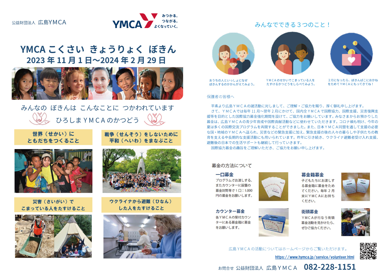 毎年11月から2月末にかけて、YMCAでは国際協力募金活動を行なっています。特に12月には、会員の 方々や子ども達と街頭に立って、市⺠のみなさまに募金を呼びかけています。募金はYMCAが行う国際 交流活動や海外の災害支援などにユースを派遣する活動に使われます。毎年、広島YMCAには150万〜 200万円の募金が寄せられています。
