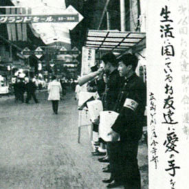 広島YMCAの募金活動のルーツは1950年12月に始まった「お友達助け合い運動」がその起源となっています。この運動は、当時の広島YMCA少年部の青少年会員を中心に、毎年12月1日~20日まで、寒風吹きすさぶ街頭で募金活動を展開し、冬の風物詩として広島の街に定着しました。高度成長期を迎え、「個人の生活救済」から「国際的な支援協力」にその目的を変え、国際協力募金へとつながっていきました。