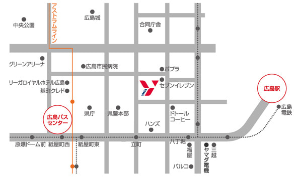 - JR広島駅より徒歩20分、市内電車(5番以外)「立町」電停下車徒歩3分