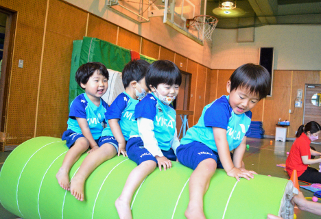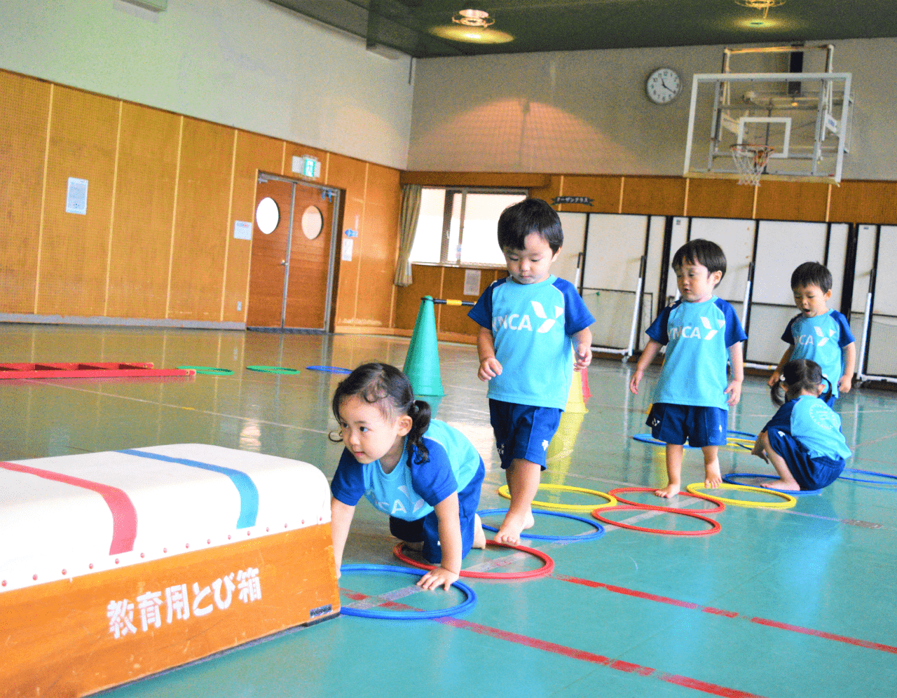 広島YMCAウエルネススポーツセンター(WAAP)の体育館で、体操専門スタッフと一緒にボールあそび・マット運動・とび箱運動などを行います。体を動かす遊びを通して、子どもたちの幼児期に必要な運動能力の向上はもちろん、お友だちとの協調性も自然に身に付いていきます。