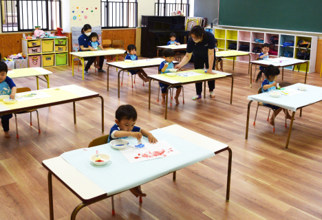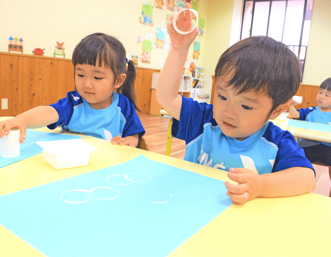 クラスリーダーと一緒に、絵の具あそび・粘土あそびから、子どもたちのオリジナルアート作品まで、自由にのびのびと創作活動を楽しみます。
