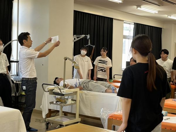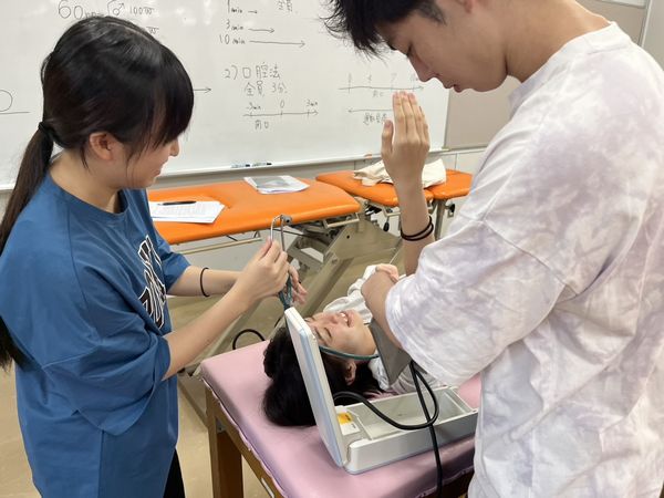 本校では、鳥取大学医学部の先生方にお越しいただき、これまでの講義で教わった血圧や心電図、筋電図、重心動揺計などの仕組みや機器の使い方、測定方法について指導を受けながら、学生同士で測定し、結果の分析を行います。