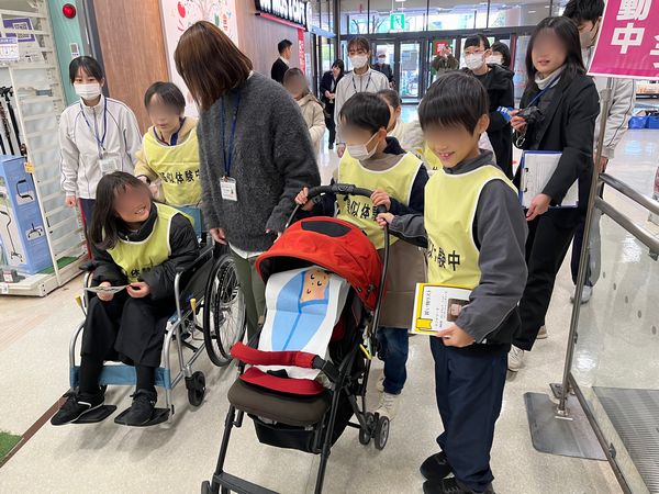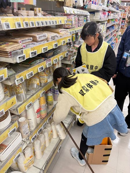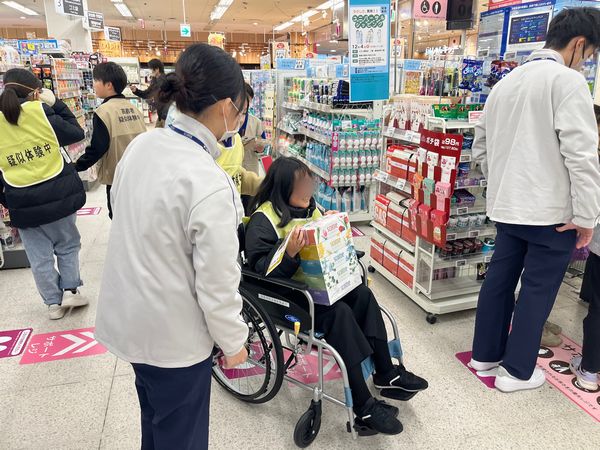 当日は、聴覚に障害のある方、目が見えにくい方、片麻痺のある方、妊婦の方、ベビーカーを利用する方など、さまざまな立場を想定した体験をしながら、実際にお店で買い物を行いました。子どもたちは、普段何気なく使っている売り場や通路、表示、店員さんとのやり取りが、人によっては大きな困りごとになることを体感しました。